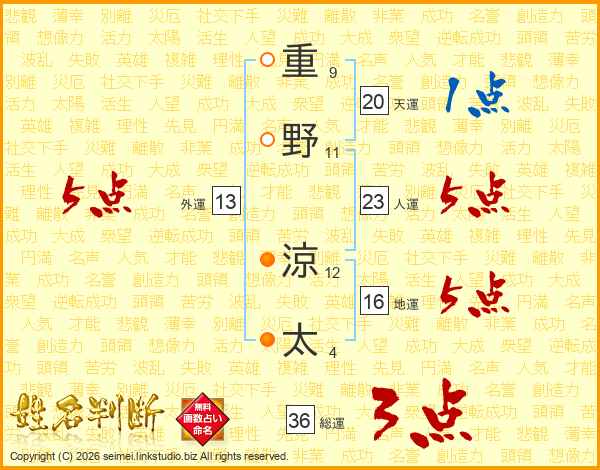 あなたの人生を表す1番重要な運勢です。生涯を通じて影響する総合運となり、主に50歳以降の晩年期に影響を及ぼします。苗字と名前の合計画数。