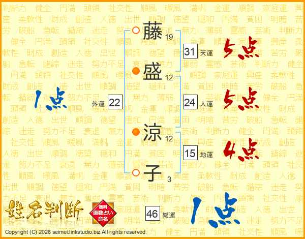 藤(19画)盛(12画) 涼(12画)子(3画)