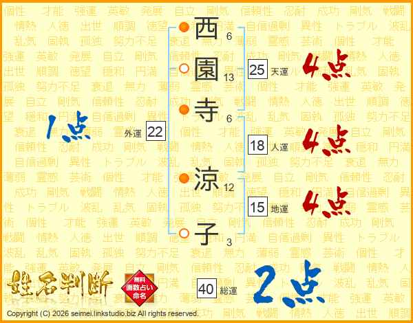 西(6画)園(13画)寺(6画) 涼(12画)子(3画)
