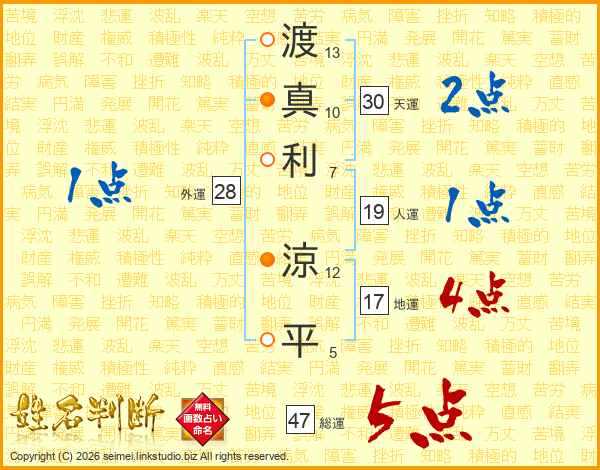 渡(13画)真(10画)利(7画) 涼(12画)平(5画)
