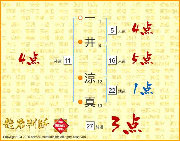 生活面を象徴する運勢です。外部から受ける影響力を表し、結婚運、家庭運や職場、環境への順応性を表します。総運から人運を引いた画数。姓や名が1文字の場合を除く。