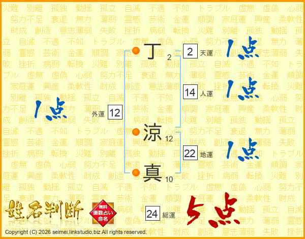 生活面を象徴する運勢です。外部から受ける影響力を表し、結婚運、家庭運や職場、環境への順応性を表します。総運から人運を引いた画数。姓や名が1文字の場合を除く。