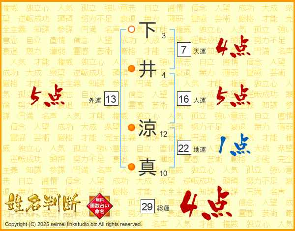 生活面を象徴する運勢です。外部から受ける影響力を表し、結婚運、家庭運や職場、環境への順応性を表します。総運から人運を引いた画数。姓や名が1文字の場合を除く。