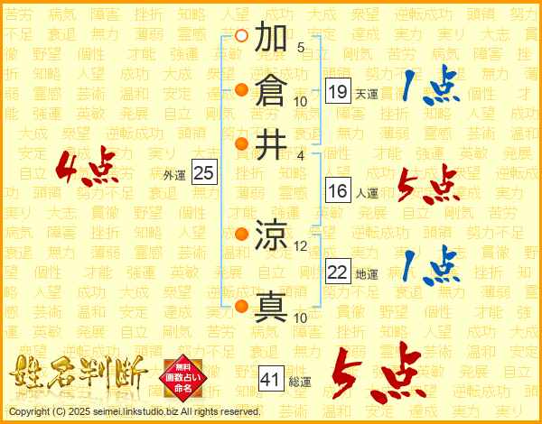 加(5画)倉(10画)井(4画) 涼(12画)真(10画)
