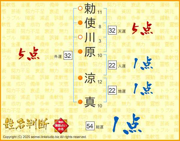 勅(11画)使(8画)川(3画)原(10画) 涼(12画)真(10画)