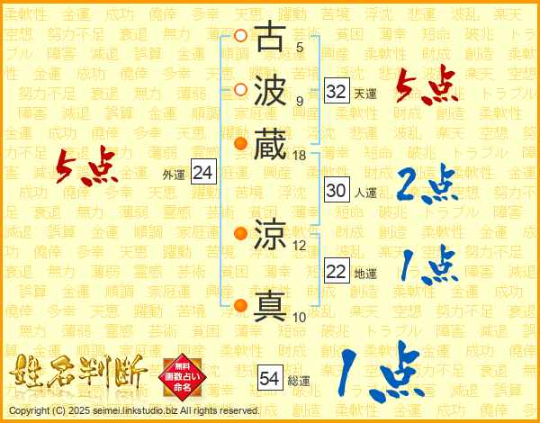 古(5画)波(9画)蔵(18画) 涼(12画)真(10画)