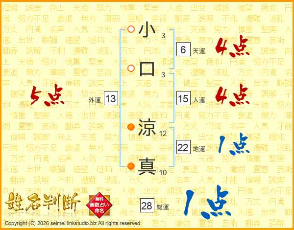 生活面を象徴する運勢です。外部から受ける影響力を表し、結婚運、家庭運や職場、環境への順応性を表します。総運から人運を引いた画数。姓や名が1文字の場合を除く。