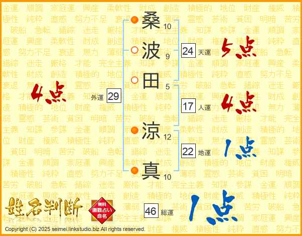桑(10画)波(9画)田(5画) 涼(12画)真(10画)