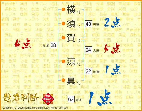 横(16画)須(12画)賀(12画) 涼(12画)真(10画)