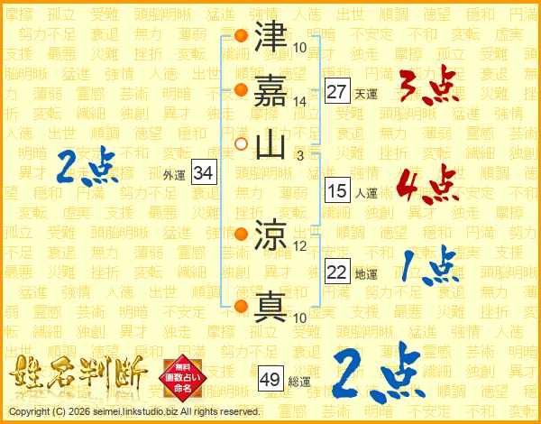 津嘉山涼真さんの総運は49画の2点!