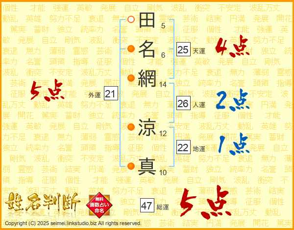 田(5画)名(6画)網(14画) 涼(12画)真(10画)