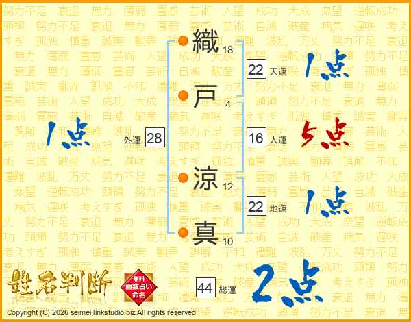 あなたの人生を表す1番重要な運勢です。生涯を通じて影響する総合運となり、主に50歳以降の晩年期に影響を及ぼします。苗字と名前の合計画数。