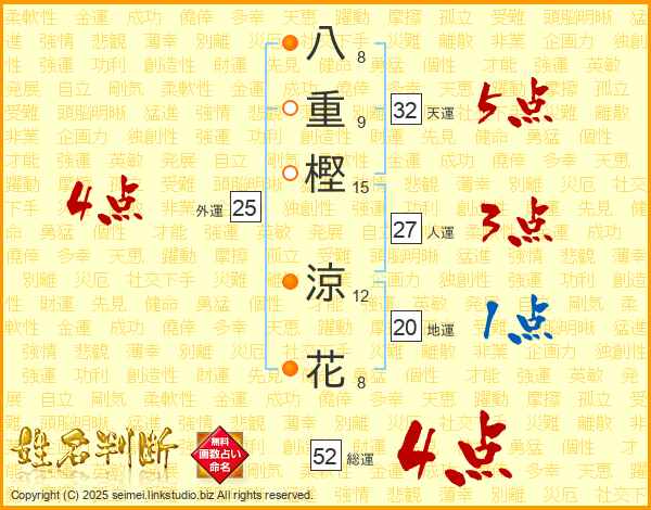 八(8画)重(9画)樫(15画) 涼(12画)花(8画)