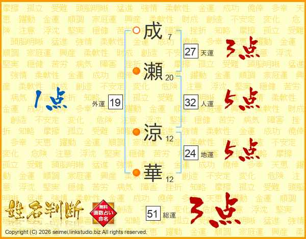 成(7画)瀬(20画) 涼(12画)華(12画)