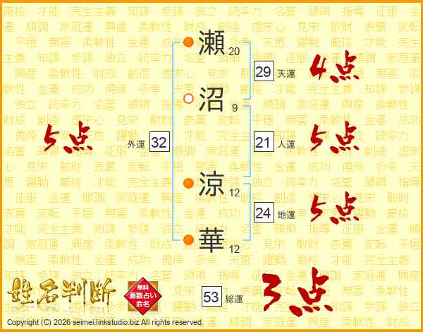 瀬(20画)沼(9画) 涼(12画)華(12画)