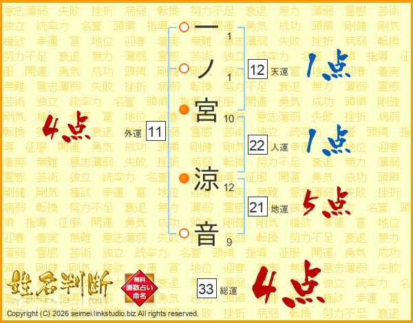 一(1画)ノ(1画)宮(10画) 涼(12画)音(9画)