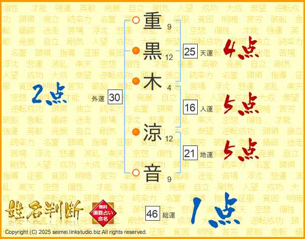 重(9画)黒(12画)木(4画) 涼(12画)音(9画)