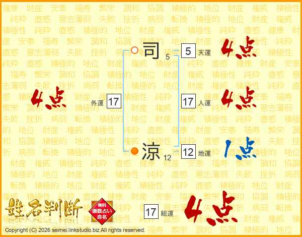 生活面を象徴する運勢です。外部から受ける影響力を表し、結婚運、家庭運や職場、環境への順応性を表します。総運から人運を引いた画数。姓や名が1文字の場合を除く。
