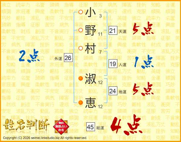 小(3画)野(11画)村(7画) 淑(12画)恵(12画)