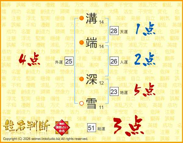 あなたの人生を表す1番重要な運勢です。生涯を通じて影響する総合運となり、主に50歳以降の晩年期に影響を及ぼします。苗字と名前の合計画数。
