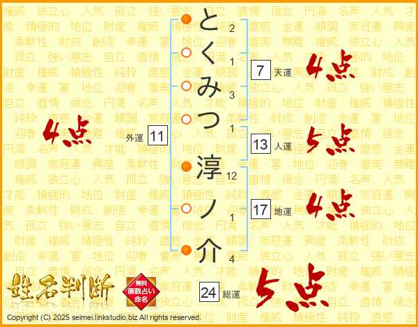 と(2画)く(1画)み(3画)つ(1画) 淳(12画)ノ(1画)介(4画)