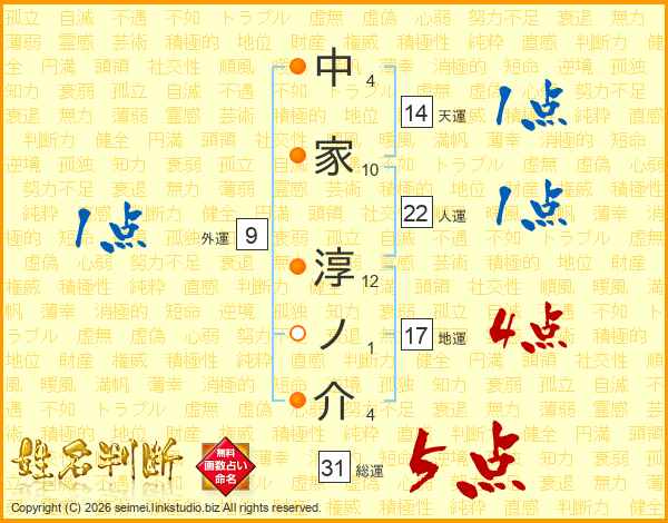 中(4画)家(10画) 淳(12画)ノ(1画)介(4画)