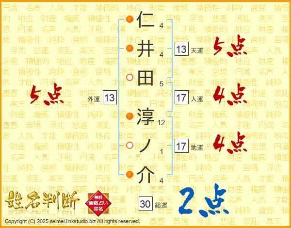 仁(4画)井(4画)田(5画) 淳(12画)ノ(1画)介(4画)