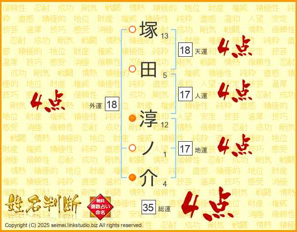塚(13画)田(5画) 淳(12画)ノ(1画)介(4画)