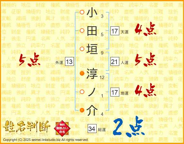 小(3画)田(5画)垣(9画) 淳(12画)ノ(1画)介(4画)