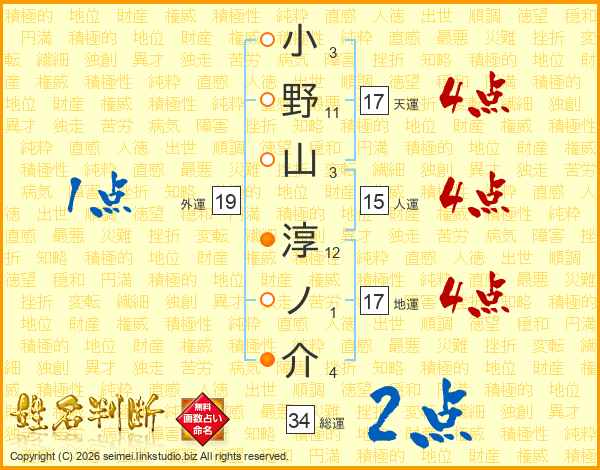 小(3画)野(11画)山(3画) 淳(12画)ノ(1画)介(4画)