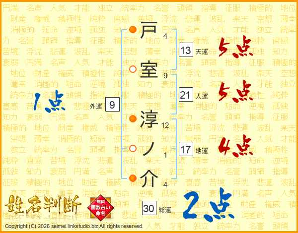 戸(4画)室(9画) 淳(12画)ノ(1画)介(4画)