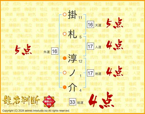 掛(11画)札(5画) 淳(12画)ノ(1画)介(4画)