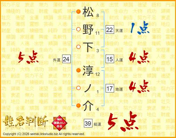 松野下淳ノ介さんの総運は39画の5点!