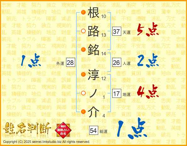 根(10画)路(13画)銘(14画) 淳(12画)ノ(1画)介(4画)