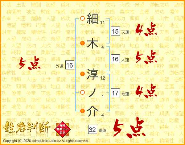 細木淳ノ介さんの総運は32画の5点!
