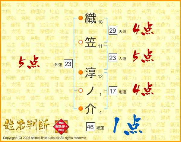 織(18画)笠(11画) 淳(12画)ノ(1画)介(4画)