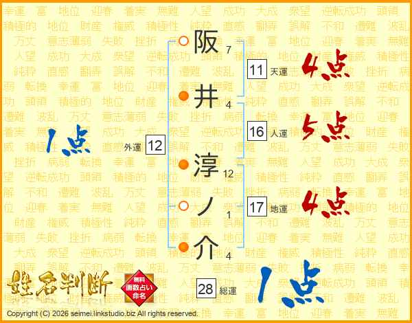 阪(7画)井(4画) 淳(12画)ノ(1画)介(4画)