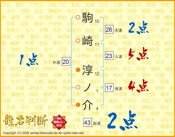 駒(15画)崎(11画) 淳(12画)ノ(1画)介(4画)