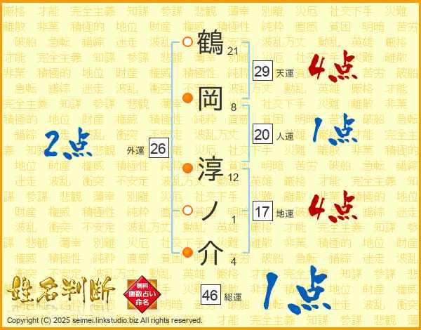 鶴(21画)岡(8画) 淳(12画)ノ(1画)介(4画)