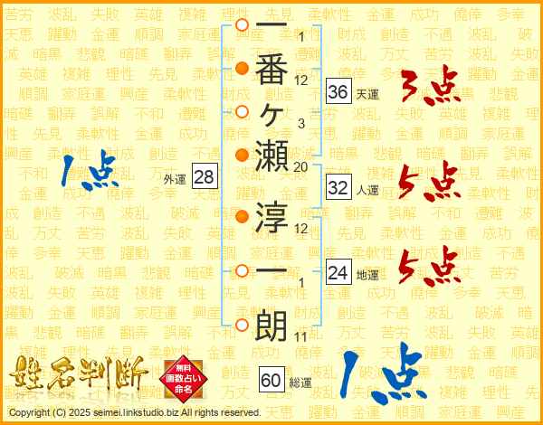 一番ヶ瀬淳一朗さんの天運は36画の3点!