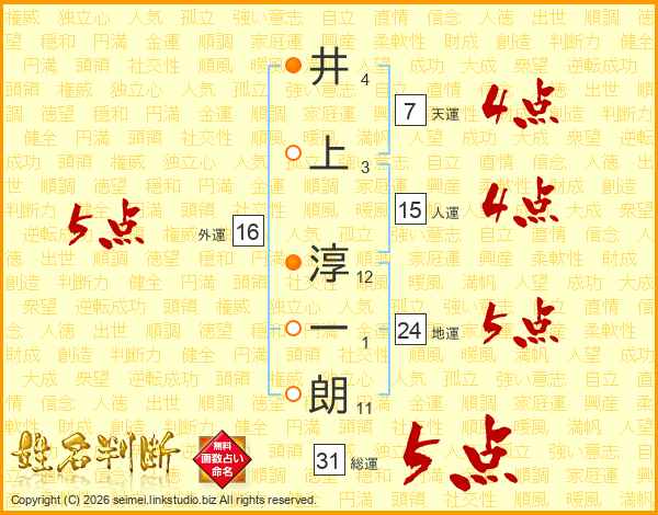 井(4画)上(3画) 淳(12画)一(1画)朗(11画)