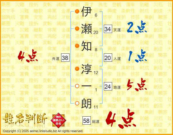伊(6画)瀬(20画)知(8画) 淳(12画)一(1画)朗(11画)