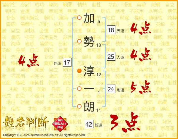 加(5画)勢(13画) 淳(12画)一(1画)朗(11画)