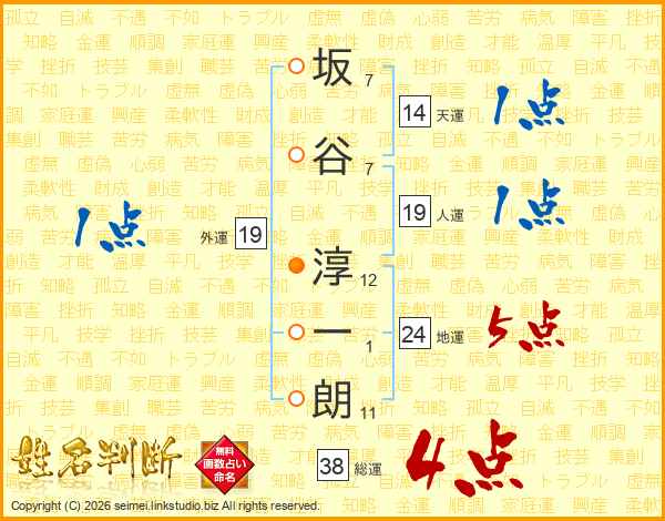 坂谷淳一朗さんの総運は38画の4点!