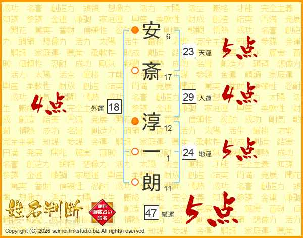 安(6画)斎(17画) 淳(12画)一(1画)朗(11画)