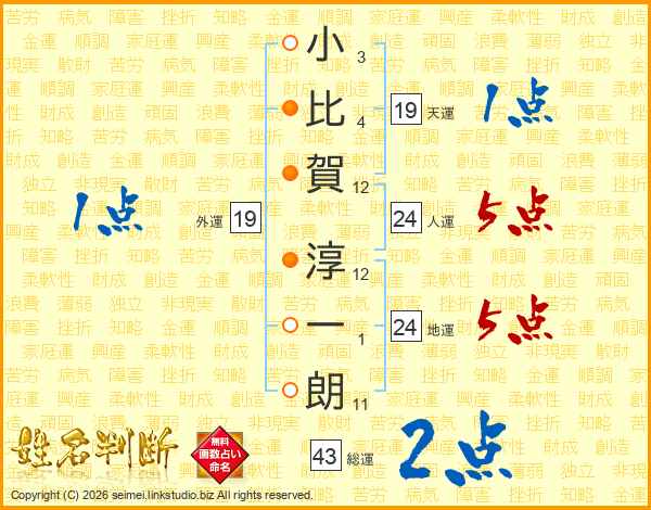 小(3画)比(4画)賀(12画) 淳(12画)一(1画)朗(11画)