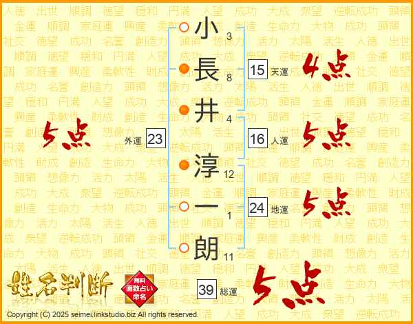 小(3画)長(8画)井(4画) 淳(12画)一(1画)朗(11画)