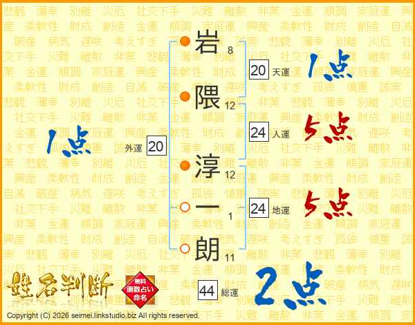 岩(8画)隈(12画) 淳(12画)一(1画)朗(11画)