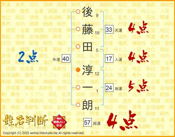 後(9画)藤(19画)田(5画) 淳(12画)一(1画)朗(11画)