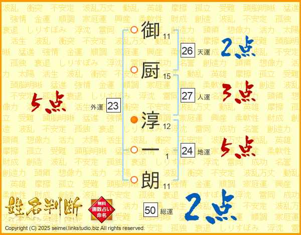 御(11画)厨(15画) 淳(12画)一(1画)朗(11画)